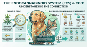 For pets, CBD is derived from industrial hemp — a cannabis variety containing less than 0.3% THC. CBD works by interacting with the endocannabinoid system (ECS), a biological regulatory network present in all mammals — dogs, cats, and horses included — that governs pain, mood, immune response, and sleep.